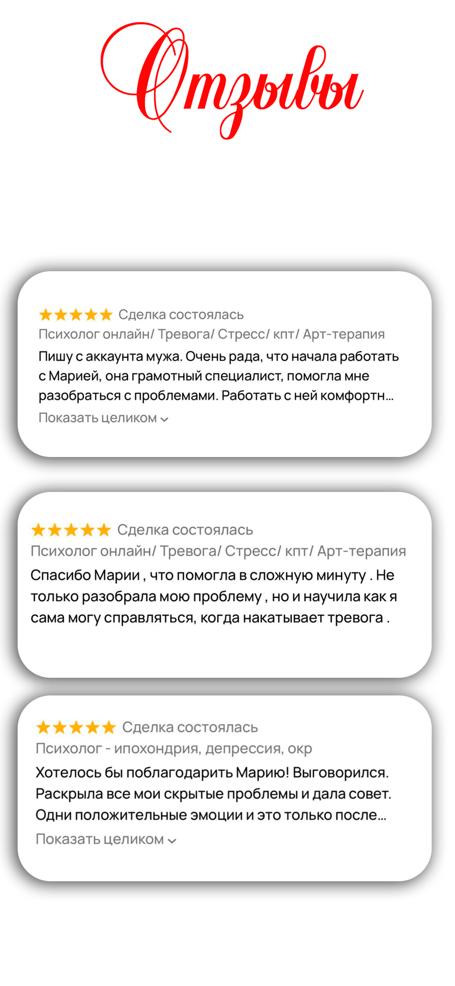Работаю в КПТ, EMDR и арт-терапии. Без эзотерики и непроверенных техник.