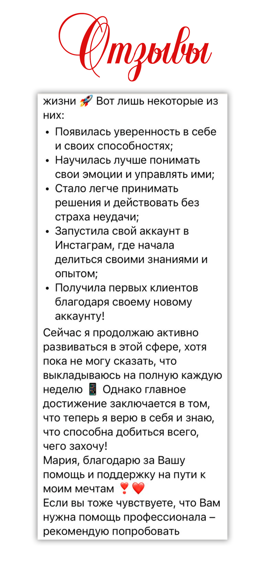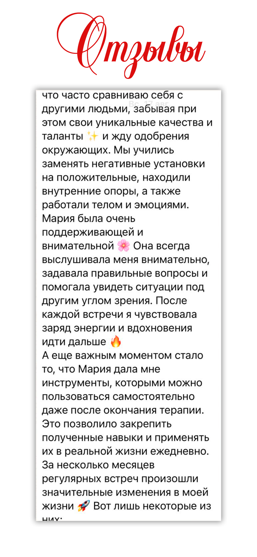 Отличаю психологические трудности от медицинских состояний и при необходимости могу рекомендовать консультацию профильного врача.