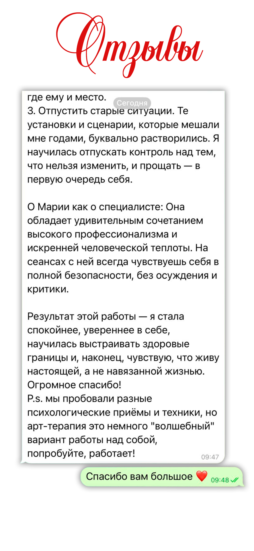 Работаю в КПТ, EMDR и арт-терапии. Без эзотерики и непроверенных техник.